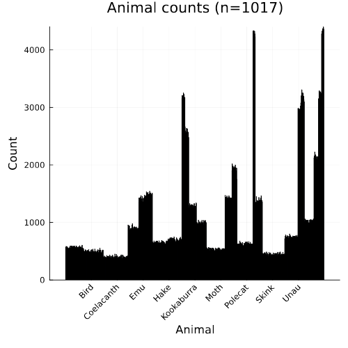 I have a friend learning Julia, so I asked him to put together a Pluto notebook to visualize just how bad it was. Here's the graph of how often animal names were selected over 1,000,000 samples: